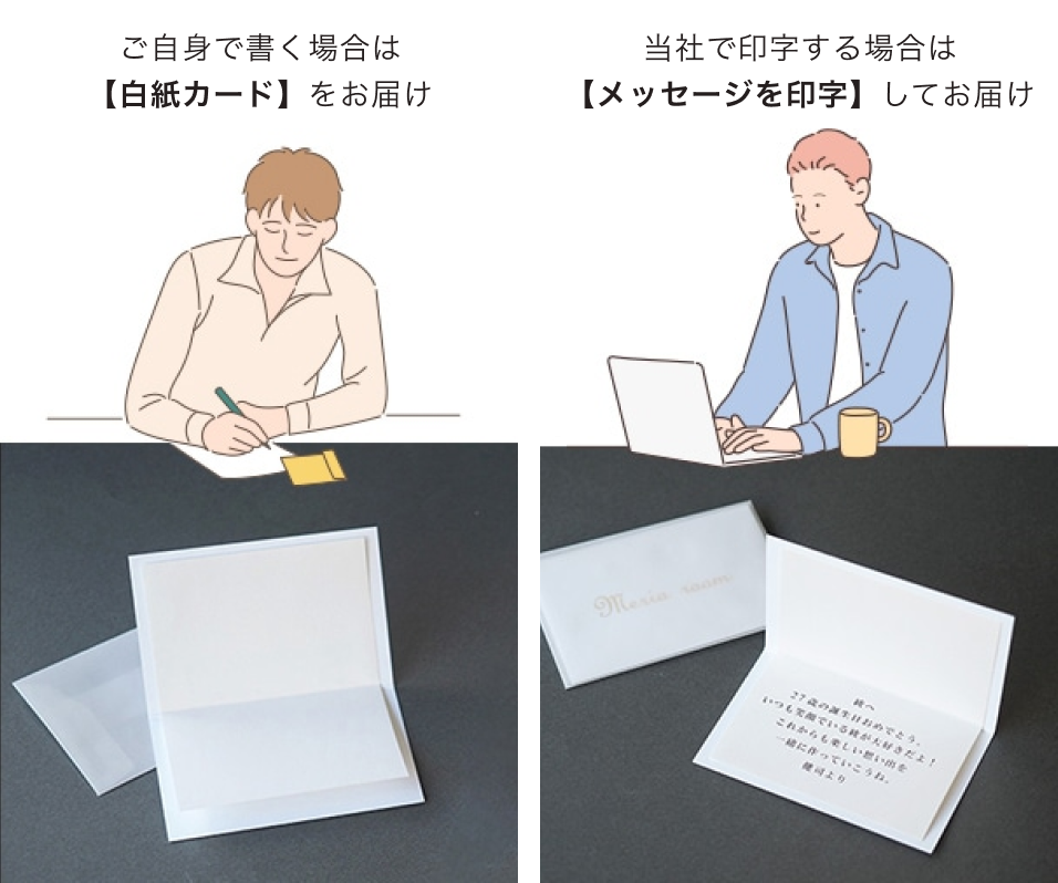 メッセージ内容をお客様ご自身で手書きする【白紙カード】と、当社でメッセージを【印字したカード】の2パターンからお選びいただけます。