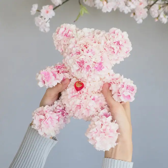 ピンクの桜で繊細にハンドメイドした愛らしいテディベア。108輪の桜を使う意味は108(トワ)=「永遠」。この愛が永遠に続くように…という願いから、プロポーズや特別な人への春のギフトにおすすめです。数量限定販売となります。