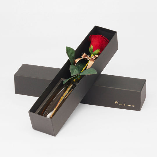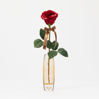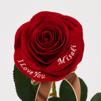 バチェラーや美女と野獣で人気の1本の赤バラ。花びらにはお相手様の名前と愛のメッセージ刺繍入り♪どんな用途にも合うサプライズ満点のレッドローズは貰った後に直ぐに飾れるよう花瓶付きな点も嬉しいポイントです!