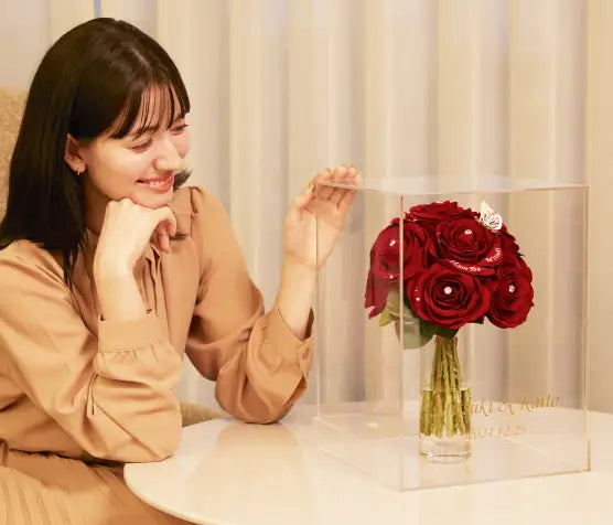 「赤いバラの花束」と「箱パカプロポーズ」を、ずっと枯れないアートフラワーで叶えるギフトセットです。