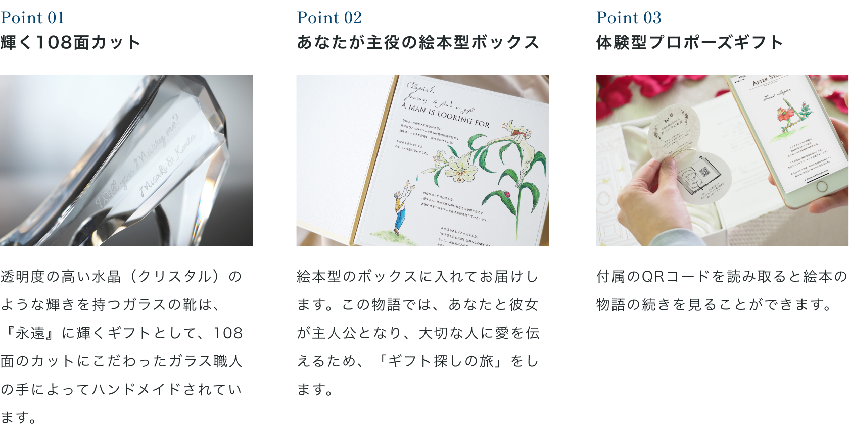 「ガラスの靴と、大切な人に贈るラブストーリー」が組み合わさった究極のプロポーズ専用ギフト。108の輝きを放つクリスタルガラスの靴にはレーザー刻印、本に入った物語にはお二人の名前が登場する、世界に1つの体験型プロポーズギフトです。