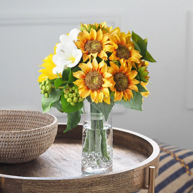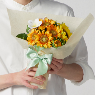 「あなただけを見つめる」という花言葉を持つひまわりは、夏の眩しい日差しに映えるビタミンカラーが、笑顔とHappyを届けます。お渡し後すぐに飾れる花瓶付きで、夏が終わってもお相手様の側で咲き続けます。