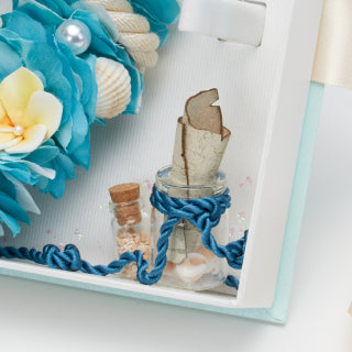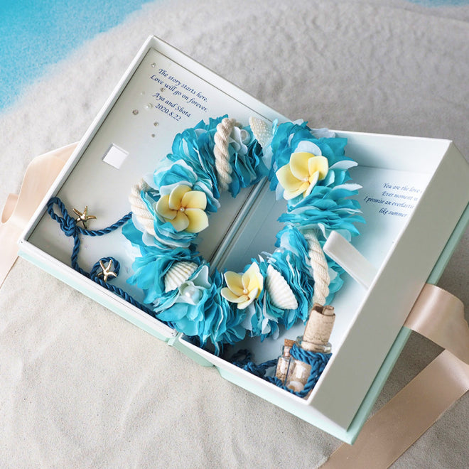 女性に人気のアジサイを使った絵本型ギフト。「二人が出逢い、永遠の愛を誓うプロポーズ、そしてこれから二人で歩む未来」の物語を、手紙と花で表現しています。広い海=広い世界で二人が出逢った運命をイメージしたデザインは、夏に思い出のあるカップルにぴったりです。