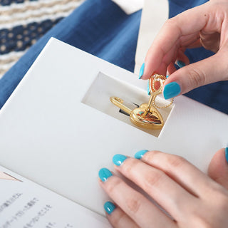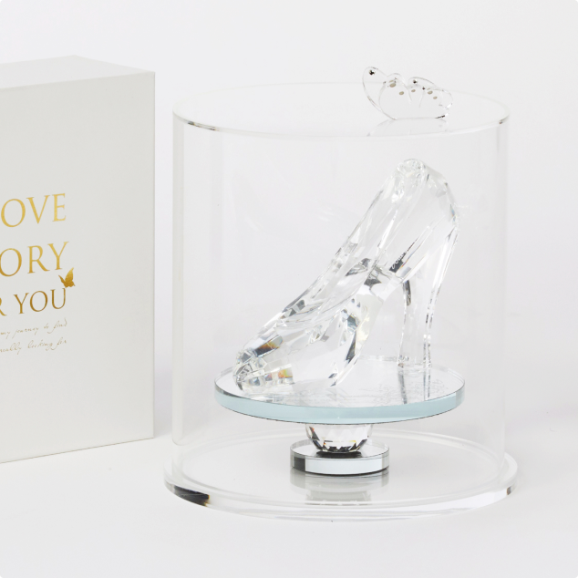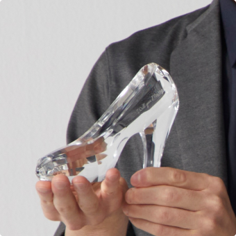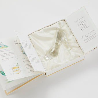 絵本を読み進むと、物語の主人公は二人だと気づき永遠の誓いに繋がる、世界に1つの体験型プロポーズギフト。絵本の最後には108面(トワ=永遠)にカットしたクリスタルガラスの靴が登場し、透明度の高い輝きを放ちます。