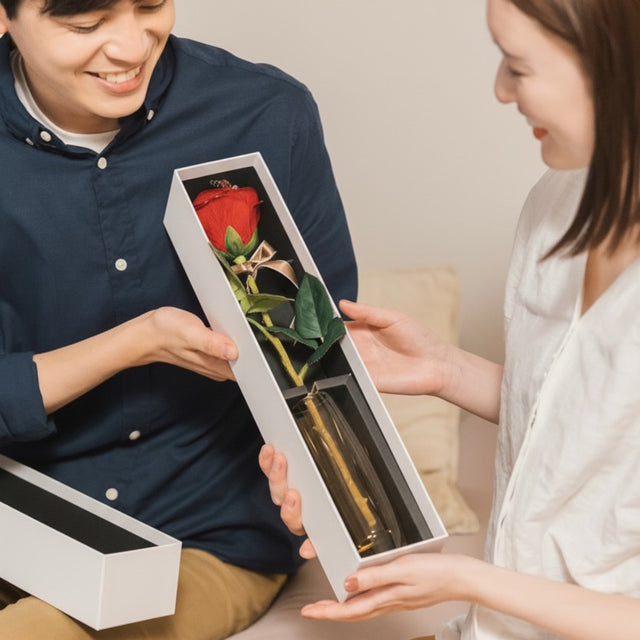 お手入れ不要でずっと咲き続ける、メリアルームオリジナル1本の赤いバラ。数日で枯れてしまう生花や数年で劣化するプリザーブドと違い、今人気の「アートフラワー(高品質な造花)製」なので、渡す瞬間も・その後も、ずっと永遠に咲き続けます。白ボックスは赤バラが主役になる設計のため、写真や実際のシーンで美しさが際立ちます。